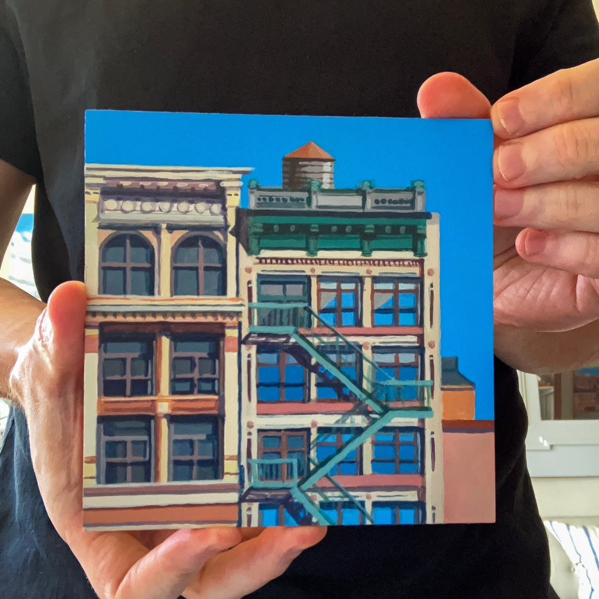 A little painting of the tops of two buildings in NYC.